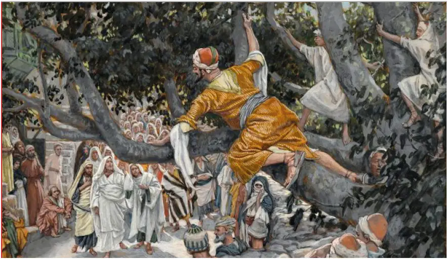 Jezus wszedł do Jerycha i przechodził przez miasto. A pewien człowiek, imieniem Zacheusz, który był zwierzchnikiem celników i był bardzo bogaty, chciał koniecznie zobaczyć Jezusa, któż to jest, ale sam nie mógł z powodu tłumu, gdyż był niskiego wzrostu. Pobiegł więc naprzód i wspiął się na sykomorę, aby móc Go ujrzeć, tamtędy bowiem miał przechodzić. Gdy Jezus przyszedł na to miejsce, spojrzał w górę i rzekł do niego: „Zacheuszu, zejdź prędko, albowiem dziś muszę się zatrzymać w twoim domu”. Zszedł więc z pośpiechem i przyjął Go rozradowany. A wszyscy, widząc to, szemrali: „Do grzesznika poszedł w gościnę”. Lecz Zacheusz stanął i rzekł do Pana: „Panie, oto połowę mego majątku daję ubogim, a jeśli kogoś w czymś skrzywdziłem, zwracam poczwórnie”. Na to Jezus rzekł do niego: „Dziś zbawienie stało się udziałem tego domu, gdyż i on jest synem Abrahama. Albowiem Syn Człowieczy przyszedł odszukać i zbawić to, co zginęło”.