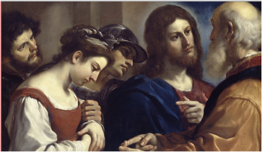 Ewangelia według św. Jana pokazuje zasadzkę, którą przygotowali na Jezusa faryzeusze i uczeni w Piśmie. Jezus miał osądzić kobietę, której udowodniono cudzołóstwo. Według Prawa Mojżeszowego za takie wykroczenie powinna być skazana na śmierć przez ukamienowanie. Rzymianie jednak pozbawili tego prawa Żydów i nie wolno im było wymierzać tej kary. Jezus znalazł się w pułapce dobrze przemyślanej przez faryzeuszy i uczonych w Piśmie. Jeżeli wydałby wyrok, że kobietę należy ukamienować, odrzuciłby władzę Rzymian i Żydzi mogliby Go przed nimi oskarżyć. Natomiast sprzeciwiając się karze śmierci, sprzeciwiłby się Prawu Mojżeszowemu, a tym samym przestałby być wiarygodny dla tych, którzy chcieli Go naśladować. Ostatecznie Jezus wykazał się mądrością, mówiąc: „Kto z was jest bez grzechu niech pierwszy rzuci w nią kamieniem” (J 8,7). W ten sposób ukazał wołającą o miłość nędzę każdego człowieka. Uświadomił również faryzeuszom i uczonym w Piśmie,