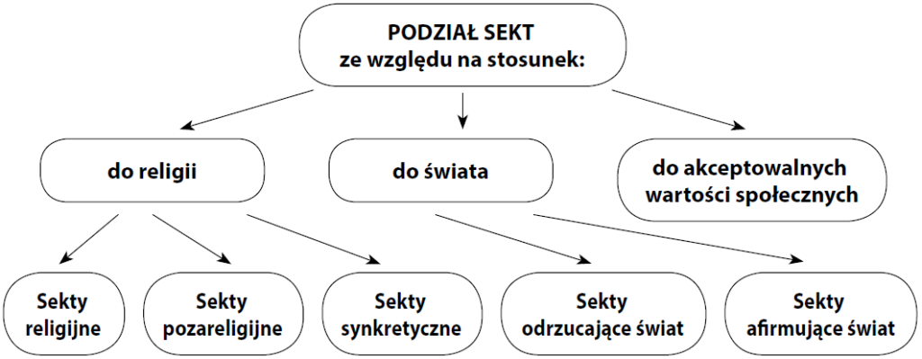 Głoszenia fałszywej nauki często prowadzi do powstania sekty. Sekta (łac. sequor – pójść za kimś, naśladować, pielęgnować wspólnotę z jakimś mistrzem) to grupa ludzi posiadająca własną doktrynę, która oddzieliła się od wyznania macierzystego, np. chrześcijaństwa, hinduizmu lub buddyzmu, oraz od innych grup z przekonaniem, że tylko ona posiada prawdę potrzebną do zbawienia. Jak czytamy w dokumencie opracowanym przez Międzyresortowy Zespół do Spraw Nowych Ruchów Religijnych, „za sektę można uznać każdą grupę, która posiadając silnie rozwiniętą strukturę władzy, jednocześnie charakteryzuje się znaczną rozbieżnością celów deklarowanych i realizowanych oraz ukrywaniem norm w sposób istotny regulujących życie członków; która narusza podstawowe prawa człowieka i zasady współżycia społecznego, a jej wpływ na członków, sympatyków, rodziny i społeczeństwo ma charakter destrukcyjny”.